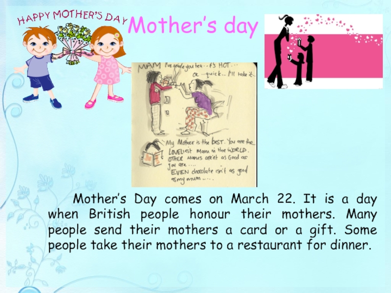 Mother’s day		Mother’s Day comes on March 22. It is a day when British people honour their mothers.