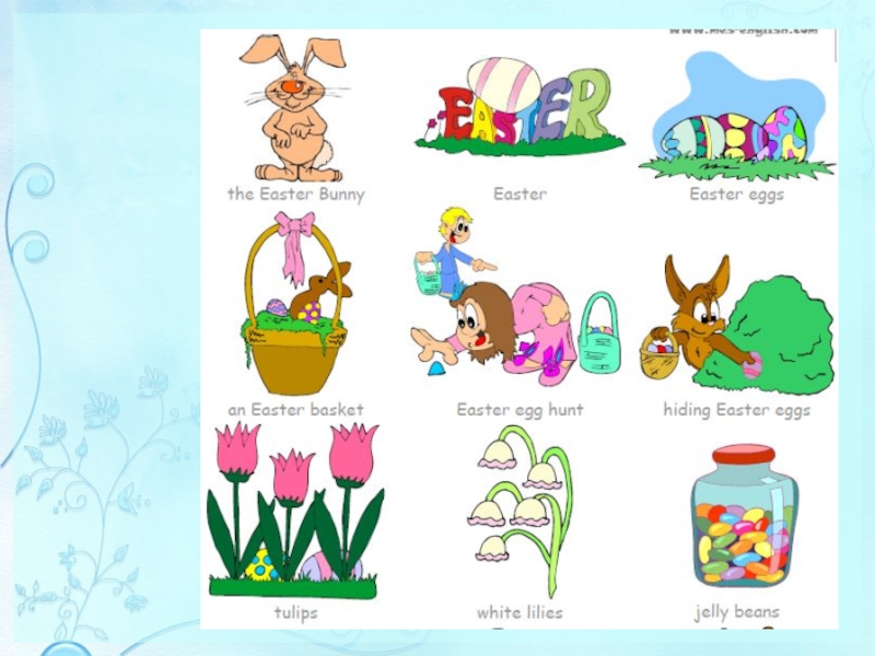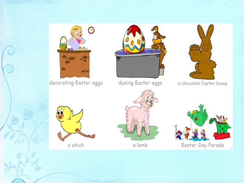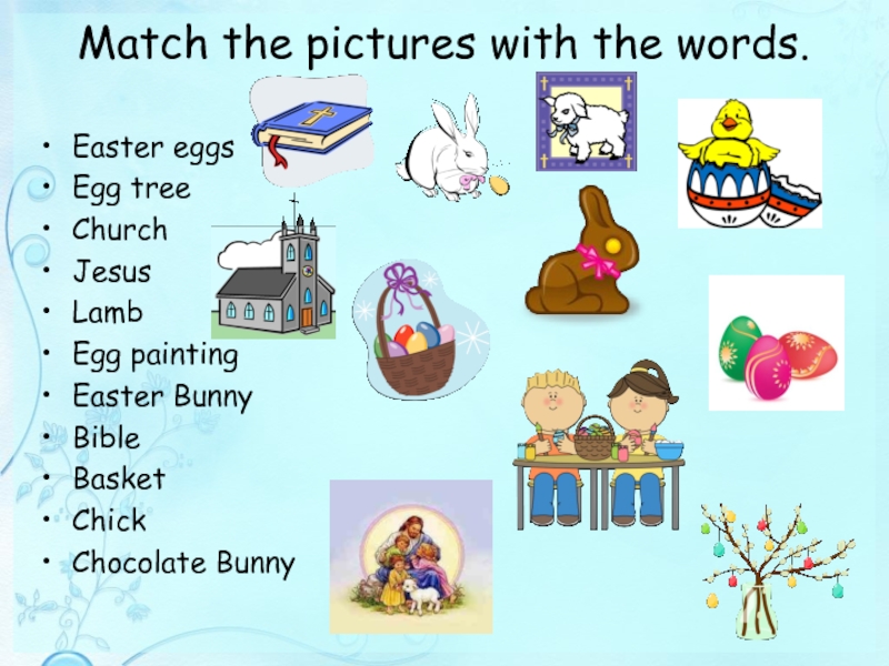 Match the pictures with the words. Easter eggsEgg treeChurch JesusLambEgg paintingEaster BunnyBibleBasketChickChocolate Bunny