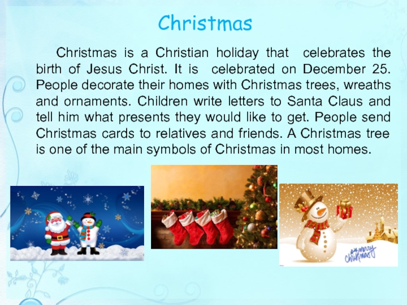 Christ. It is celebrated on December 25. People decorate their homes with Christmas trees, wreaths and ornaments. Children write letters to Santa Claus and tell him what presents they would like to get. People send Christmas cards to relatives and friends. A Christmas tree is one of the main symbols of Christmas in most homes.