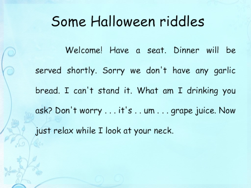 Some Halloween riddles			Welcome! Have a seat. Dinner will be served shortly. Sorry we don't have any garlic