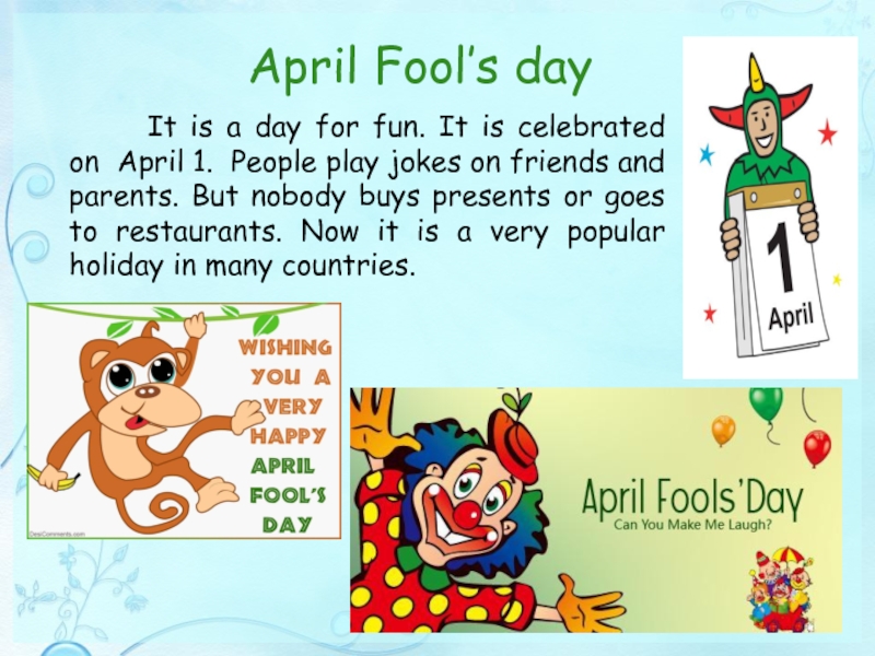 on April 1. People play jokes on friends and parents. But nobody buys presents or goes to restaurants. Now it is a very popular holiday in many countries.