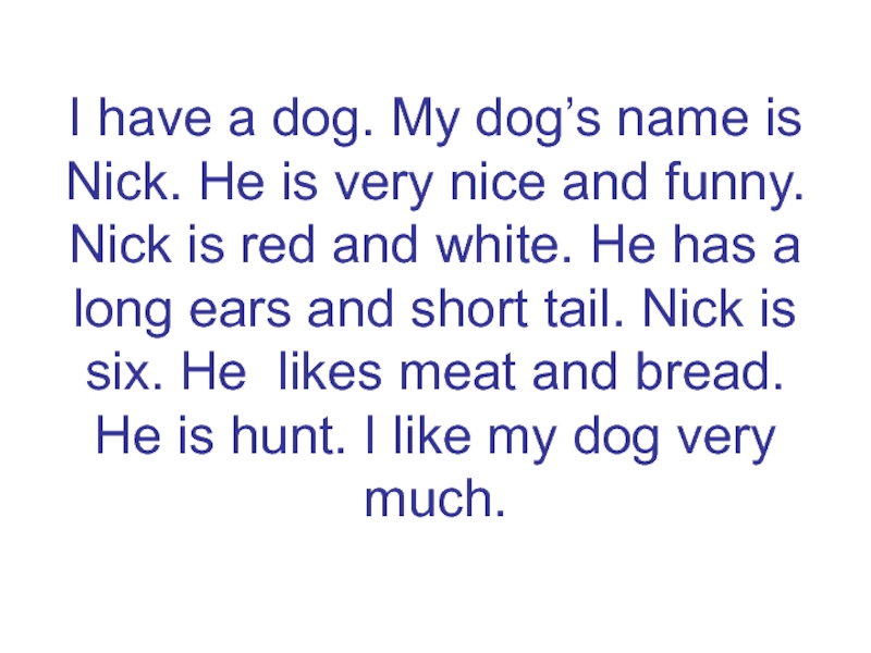 I have a dog. My dog’s name is Nick. He is very nice and funny. Nick is