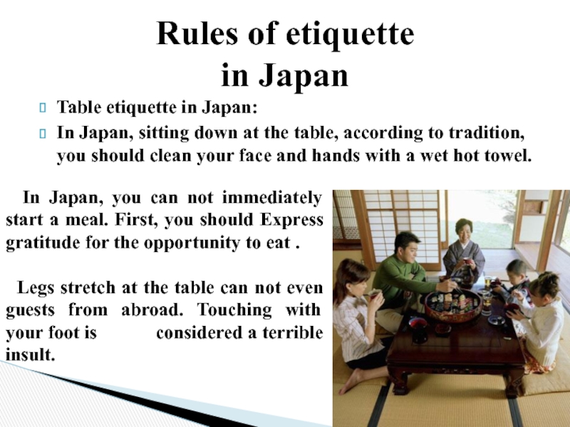 Legs stretch at the table can not even guests from abroad. Touching with your foot is considered a terrible insult.
