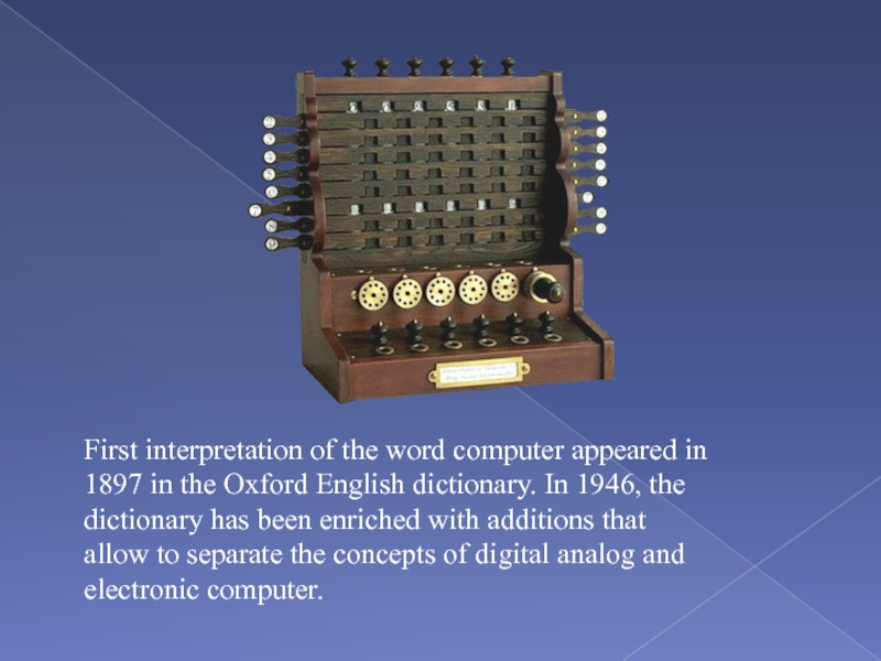 Слайд 4First interpretation of the word computer appeared in 1897 in the
