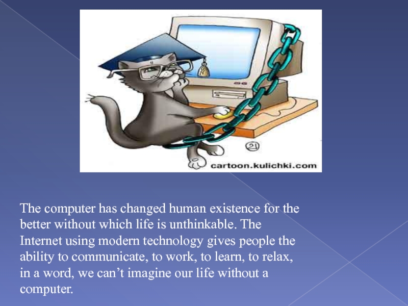 life is unthinkable. The Internet using modern technology gives people the ability to communicate, to work, to learn, to relax, in a word, we can’t imagine our life without a computer.