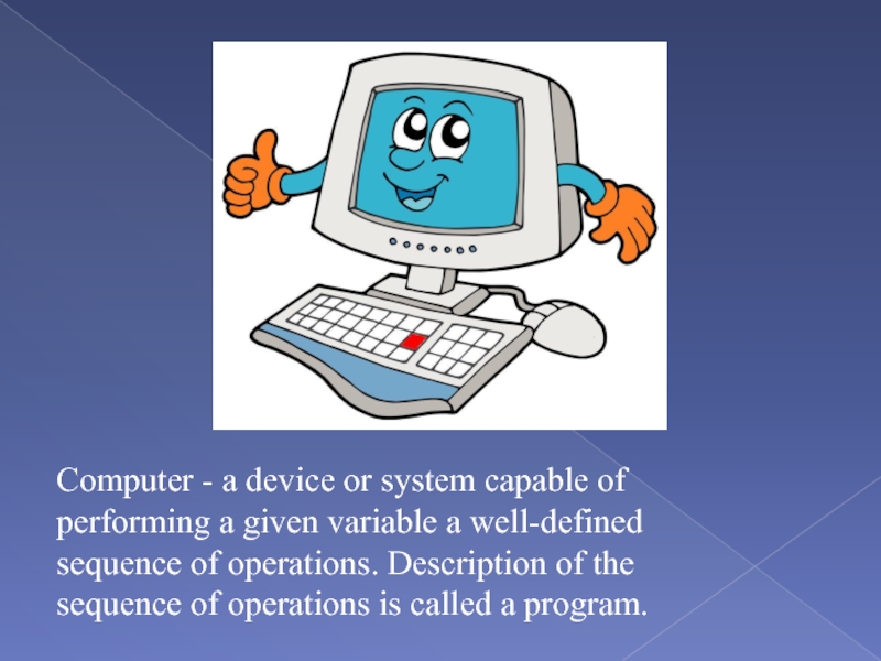 Computer - a device or system capable of performing a given variable a well-defined sequence of operations. Description of the sequence of operations is called a program.