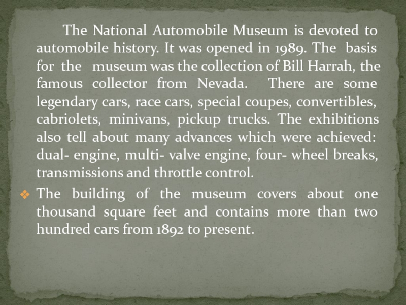 automobile history. It was opened in 1989. The basis for the museum was the collection of Bill Harrah, the famous collector from Nevada. There are some legendary cars, race cars, special coupes, convertibles, cabriolets, minivans, pickup trucks. The exhibitions also tell about many advances which were achieved: dual- engine, multi- valve engine, four- wheel breaks, transmissions and throttle control.