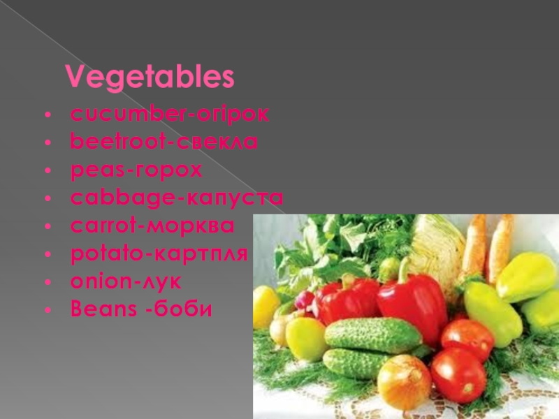 Vegetablescucumber-огірокbeetroot-свеклаpeas-горохcabbage-капустаcarrot-моркваpotato-картпляonion-лукBeans -боби