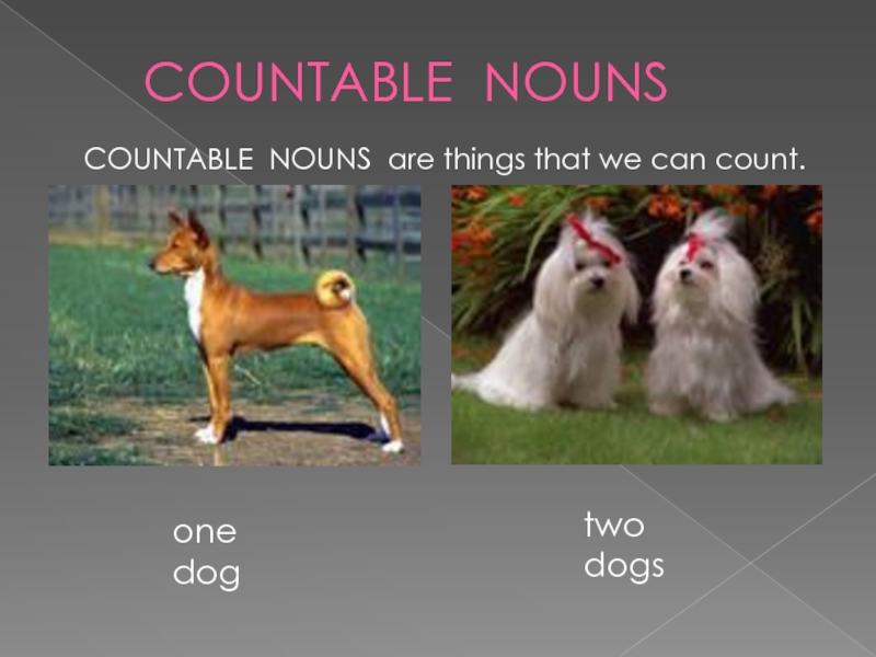 СOUNTABLE NOUNSСOUNTABLE NOUNS are things that we can count.one dogtwo dogs