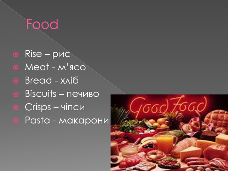 FoodRise – рисMeat - м’ясоBread - хлібBiscuits – печивоCrisps – чіпсиPasta - макарони