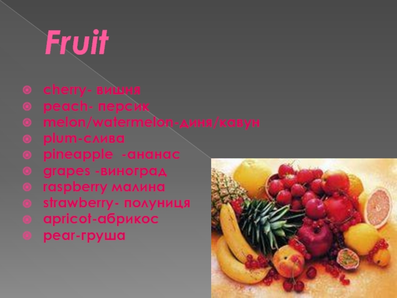 Fruitcherry- вишняpeach- персикmelon/watermelon-диня/кавунplum-сливаpineapple -ананасgrapes -виноградraspberry малинаstrawberry- полуницяapricot-абрикосpear-груша