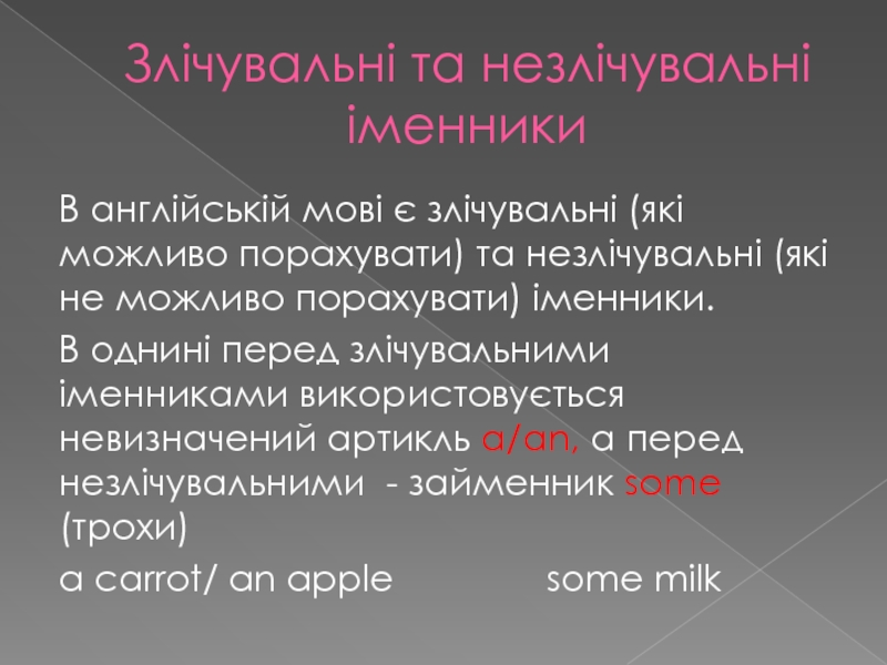 Злічувальні та незлічувальні іменникиВ англійській мові є злічувальні (які можливо порахувати) та незлічувальні (які не можливо порахувати)