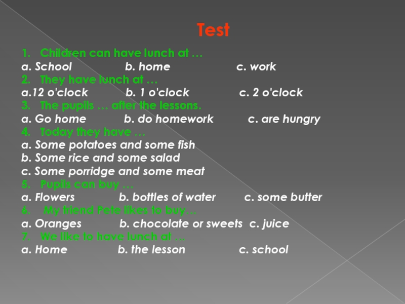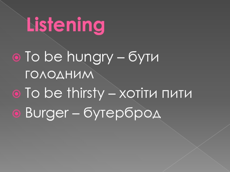 ListeningTo be hungry – бути голоднимTo be thirsty – хотіти питиBurger – бутерброд