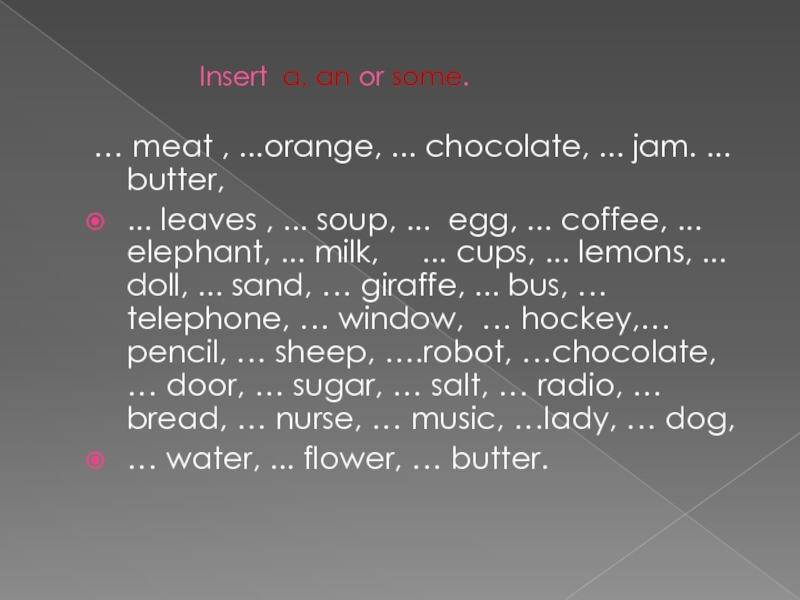 Insert a, an or some. … meat , ...orange, ... chocolate, ...
