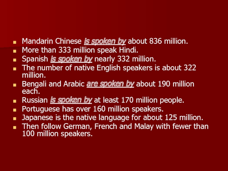 Mandarin Chinese is spoken by about 836 million.More than 333 million speak Hindi.Spanish is spoken by nearly