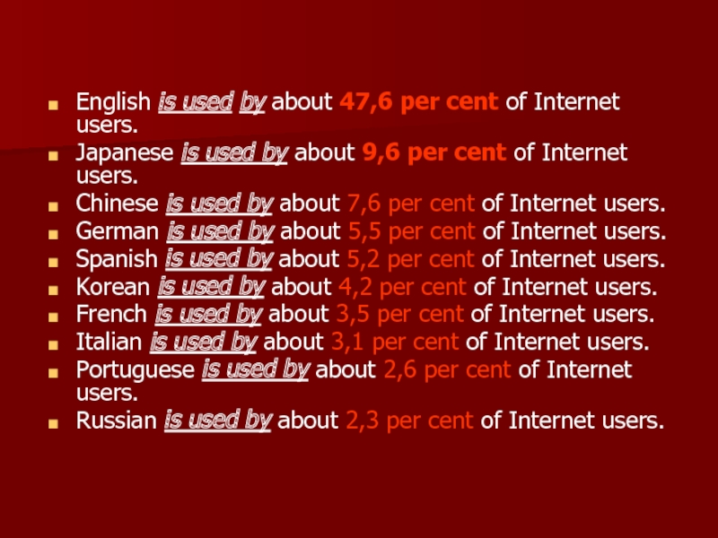 English is used by about 47,6 per cent of Internet users.Japanese is used by about 9,6 per