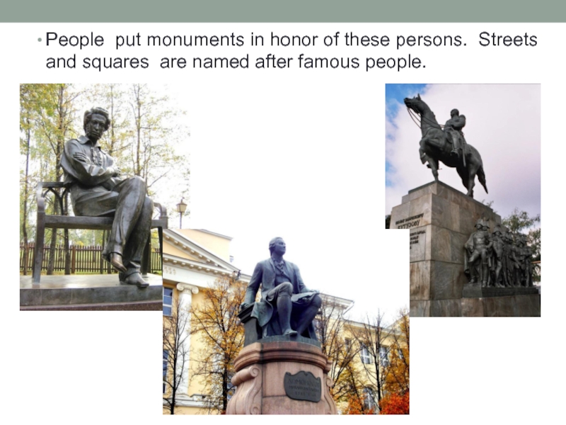 Слайд 9People put monuments in honor of these persons. Streets and squares