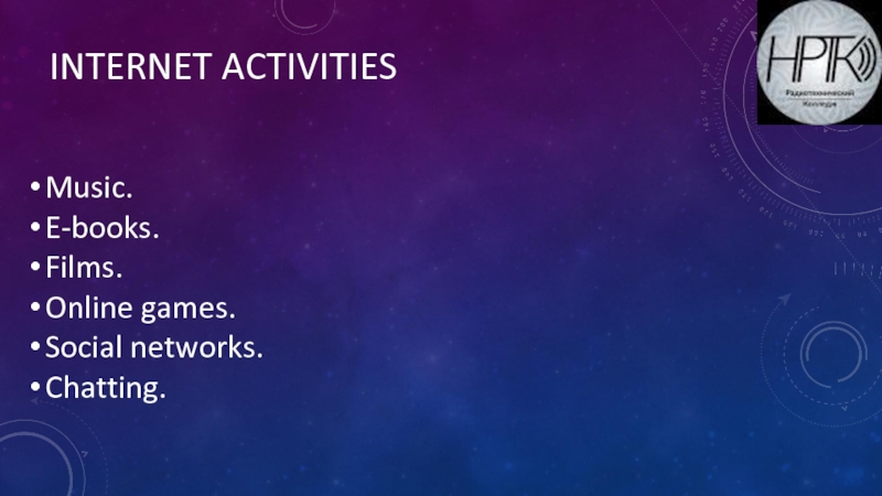Internet activities Music.E-books. Films. Online games.Social networks. Chatting.