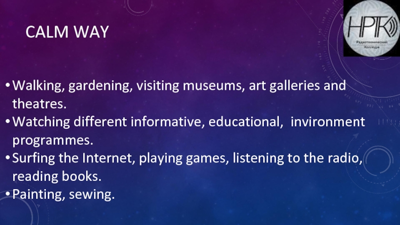 CALM WAYWalking, gardening, visiting museums, art galleries and theatres.Watching different informative, educational, invironment programmes.Surfing the Internet, playing