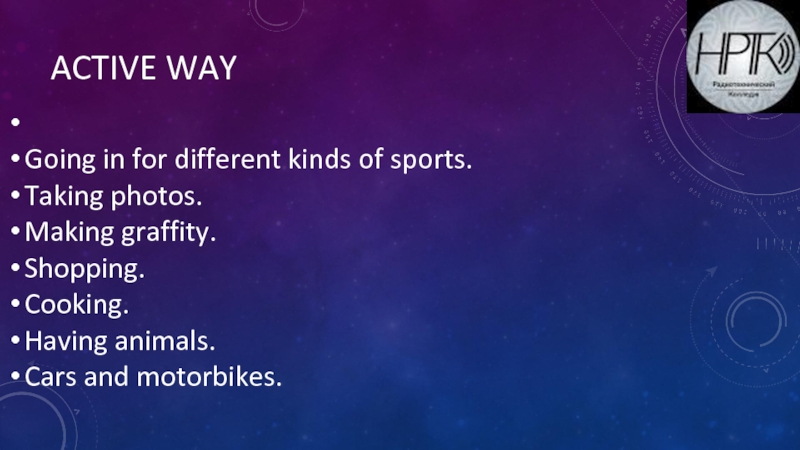 ACTIVE WAY Going in for different kinds of sports.Taking photos.Making graffity.Shopping.Cooking.Having animals.Cars and motorbikes.