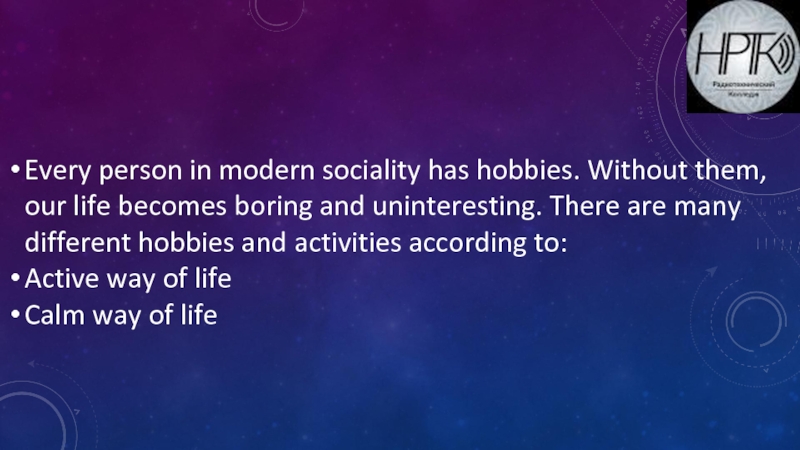Слайд 2Every person in modern sociality has hobbies. Without them, our life