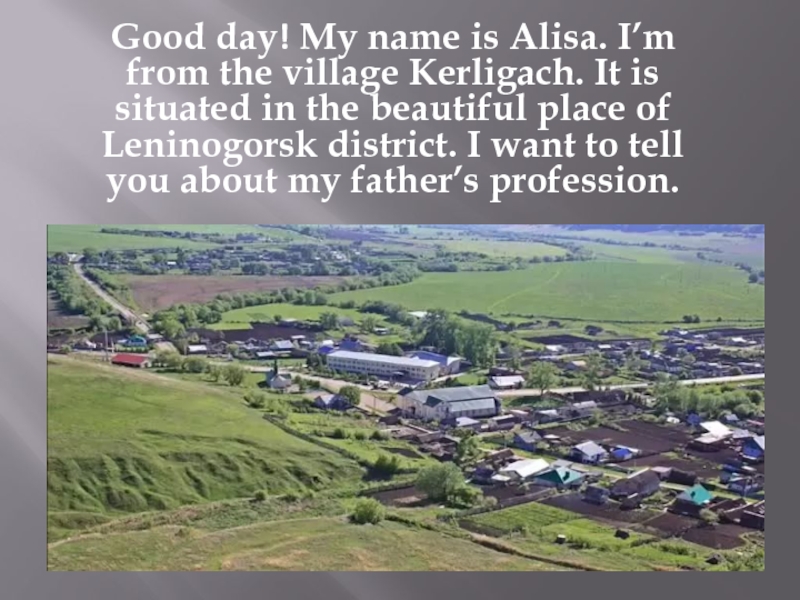 Good day! My name is Alisa. I’m from the village Kerligach. It is situated in the beautiful place of Leninogorsk district. I want to tell you about my father’s profession.