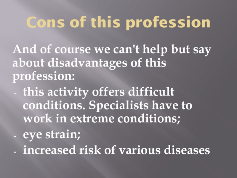Слайд 5Cons of this profession