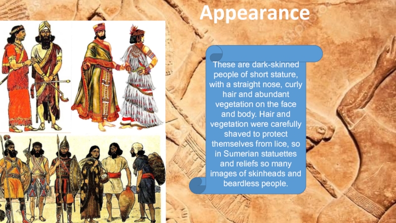 curly hair and abundant vegetation on the face and body. Hair and vegetation were carefully shaved to protect themselves from lice, so in Sumerian statuettes and reliefs so many images of skinheads and beardless people.