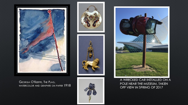 Слайд 11A wrecked car installed on a pole near the museum, taken