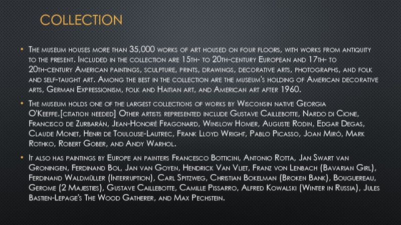 The museum holds one of the largest collections of works by Wisconsin native Georgia O'Keeffe.[citation needed] Other artists represented include Gustave Caillebotte, Nardo di Cione, Francisco de Zurbarán, Jean-Honoré Fragonard, Winslow Homer, Auguste Rodin, Edgar Degas, Claude Monet, Henri de Toulouse-Lautrec, Frank Lloyd Wright, Pablo Picasso, Joan Miró, Mark Rothko, Robert Gober, and Andy Warhol.