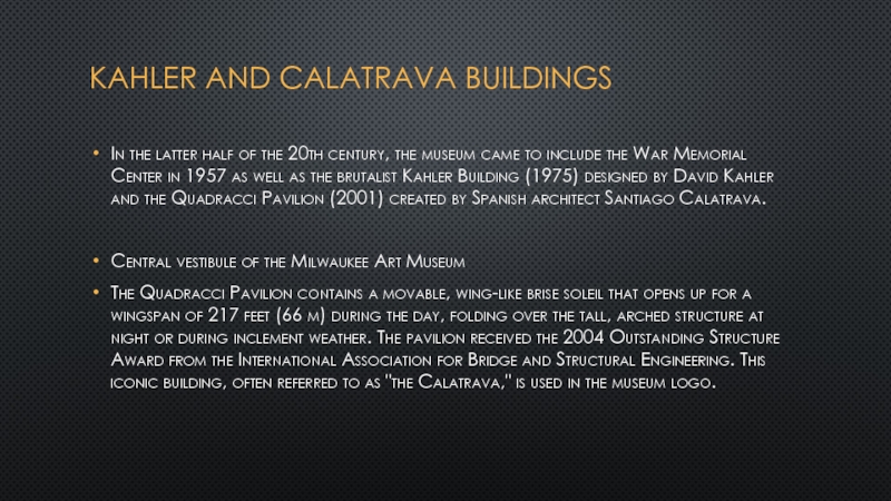 the museum came to include the War Memorial Center in 1957 as well as the brutalist Kahler Building (1975) designed by David Kahler and the Quadracci Pavilion (2001) created by Spanish architect Santiago Calatrava.