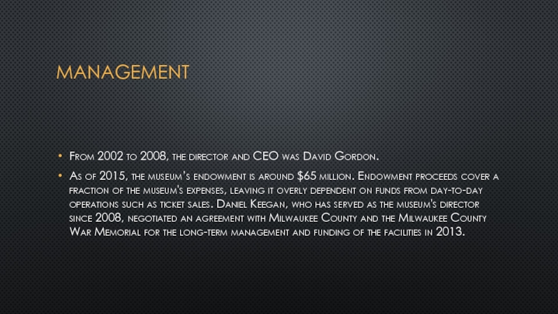 of 2015, the museum’s endowment is around $65 million. Endowment proceeds cover a fraction of the museum's expenses, leaving it overly dependent on funds from day-to-day operations such as ticket sales. Daniel Keegan, who has served as the museum's director since 2008, negotiated an agreement with Milwaukee County and the Milwaukee County War Memorial for the long-term management and funding of the facilities in 2013.