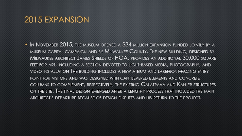 funded jointly by a museum capital campaign and by Milwaukee County. The new building, designed by Milwaukee architect James Shields of HGA, provides an additional 30,000 square feet for art, including a section devoted to light-based media, photography, and video installation The building includes a new atrium and lakefront-facing entry point for visitors and was designed with cantilevered elements and concrete columns to complement, respectively, the existing Calatrava and Kahler structures on the site. The final design emerged after a lengthy process that included the main architect's departure because of design disputes and his return to the project.