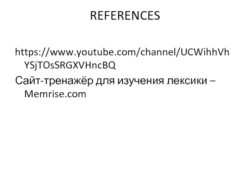 REFERENCES https://www.youtube.com/channel/UCWihhVhYSjTOsSRGXVHncBQ Сайт-тренажёр для изучения лексики – Memrise.com