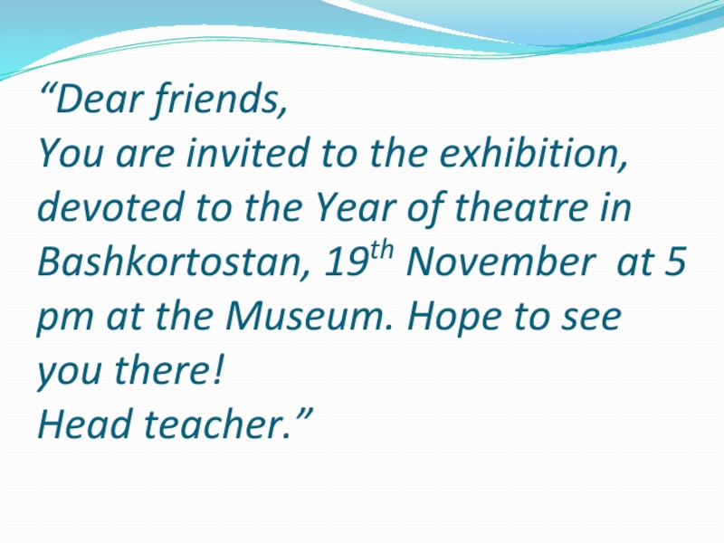 of theatre in Bashkortostan, 19th November at 5 pm at the Museum. Hope to see you there! Head teacher.”