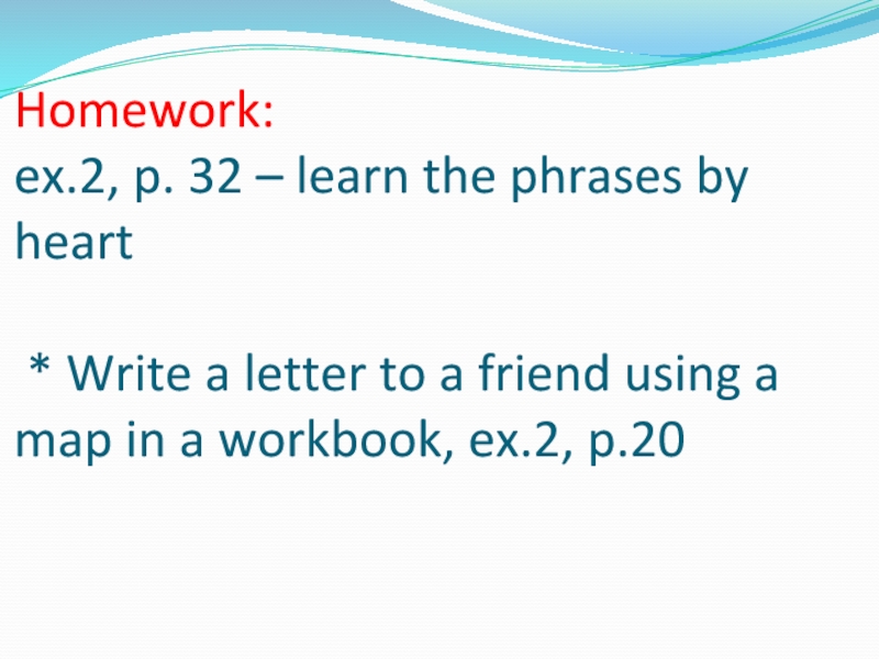 Homework:  ex.2, p. 32 – learn the phrases by heart   * Write a letter