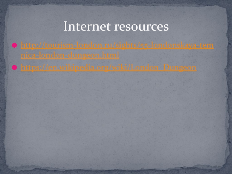 http://tourism-london.ru/sights/55-londonskaya-temnica-london-dungeon.htmlhttps://en.wikipedia.org/wiki/London_DungeonInternet resources