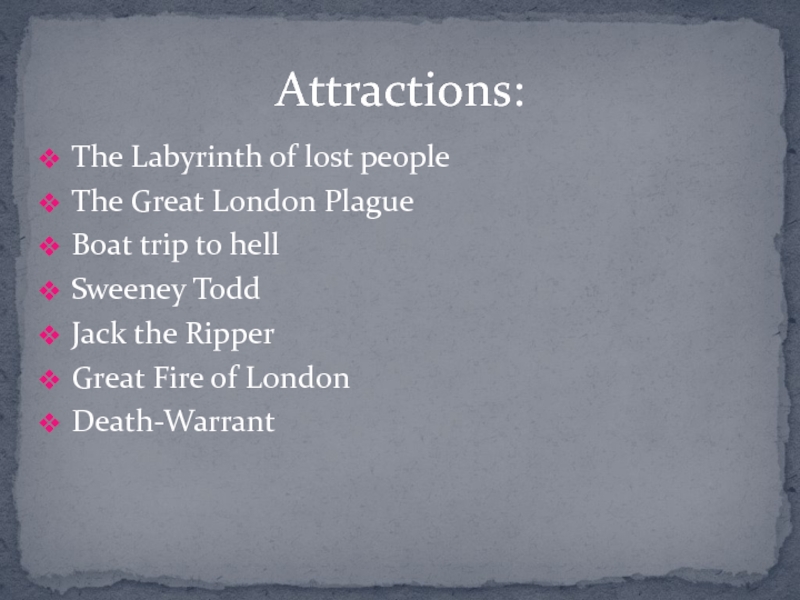 The Labyrinth of lost peopleThe Great London PlagueBoat trip to hellSweeney ToddJack the RipperGreat Fire of LondonDeath-Warrant Attractions: