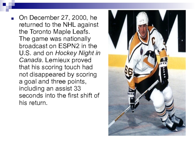Слайд 9On December 27, 2000, he returned to the NHL against the Toronto