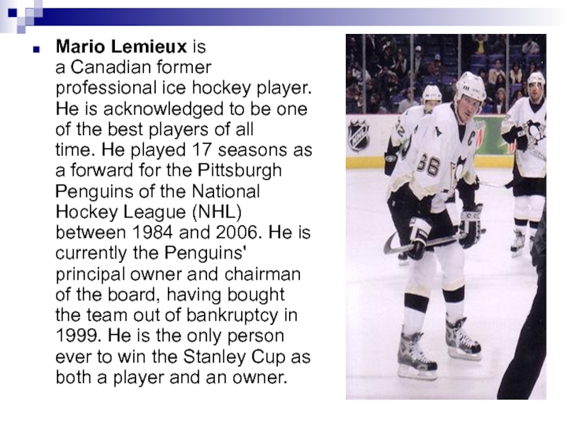 Слайд 2Mario Lemieux is a Canadian former professional ice hockey player. He is acknowledged to be
