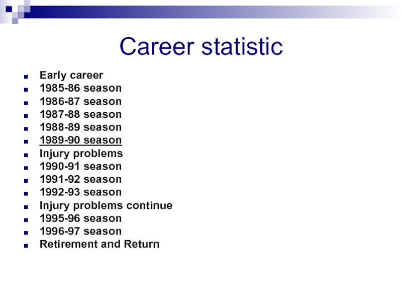 Career statisticEarly career1985-86 season1986-87 season1987-88 season1988-89 season1989-90 seasonInjury problems1990-91 season1991-92 season1992-93 seasonInjury problems continue1995-96 season1996-97 seasonRetirement and