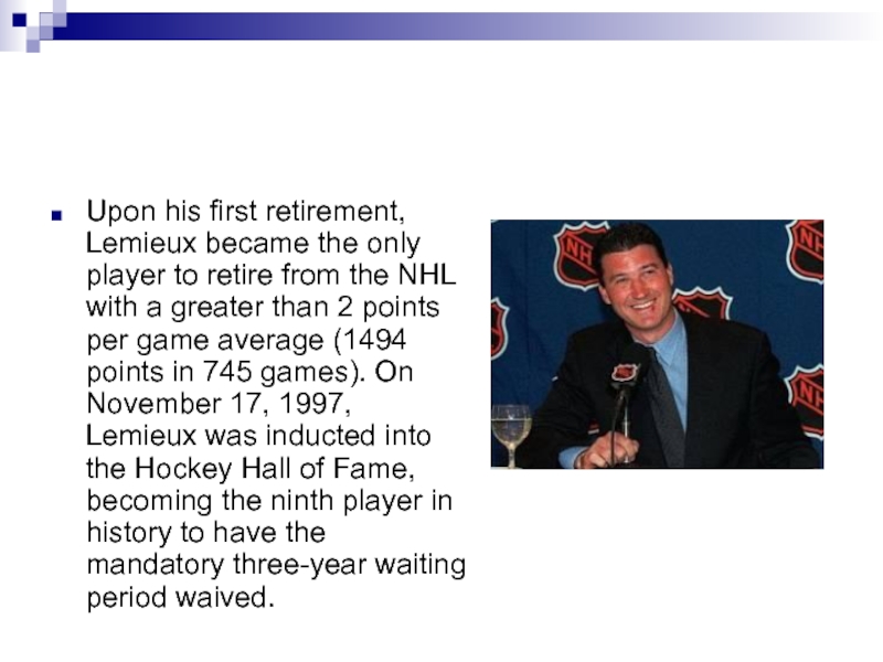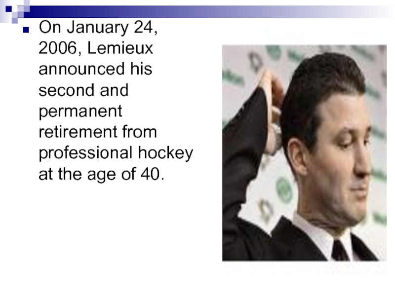 Слайд 10On January 24, 2006, Lemieux announced his second and permanent retirement
