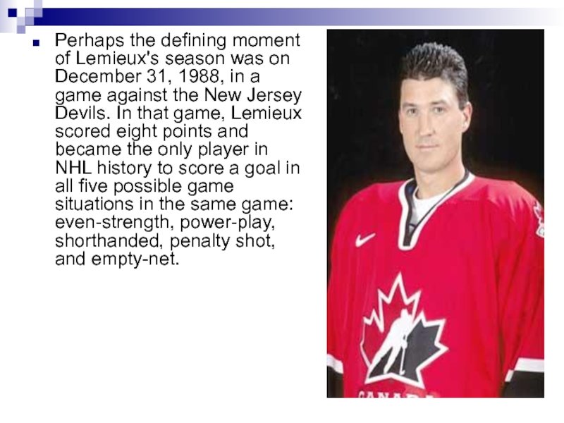 Слайд 6Perhaps the defining moment of Lemieux's season was on December 31,