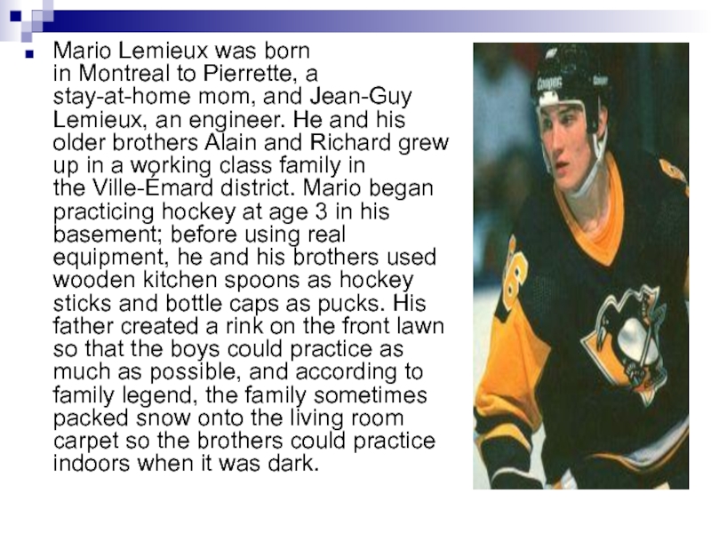 Слайд 3Mario Lemieux was born in Montreal to Pierrette, a stay-at-home mom, and Jean-Guy