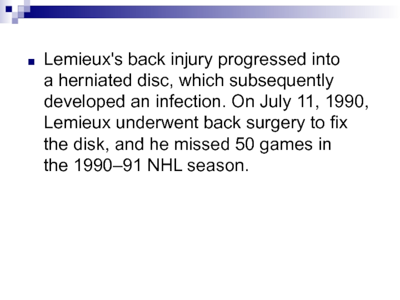 Слайд 7Lemieux's back injury progressed into a herniated disc, which subsequently developed an