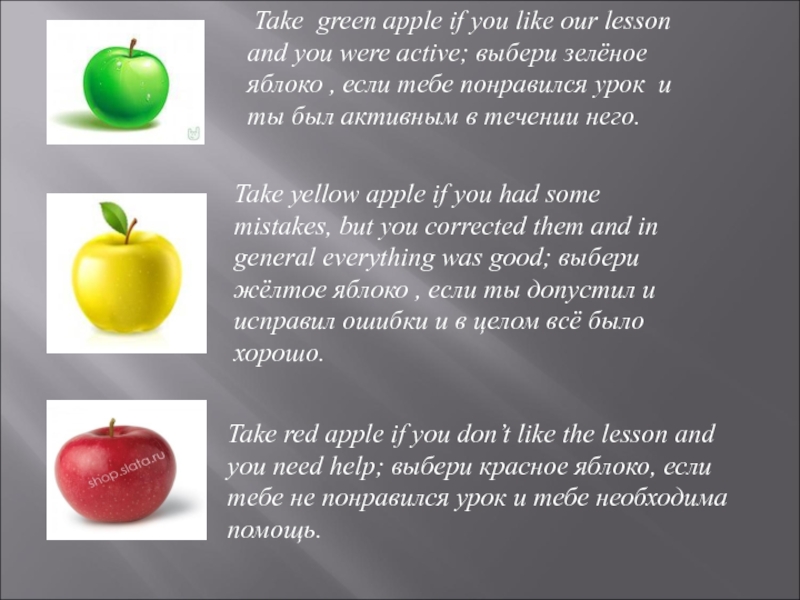 Take red apple if you don’t like the lesson and you need help; выбери красное яблоко, если тебе не понравился урок и тебе необходима помощь.