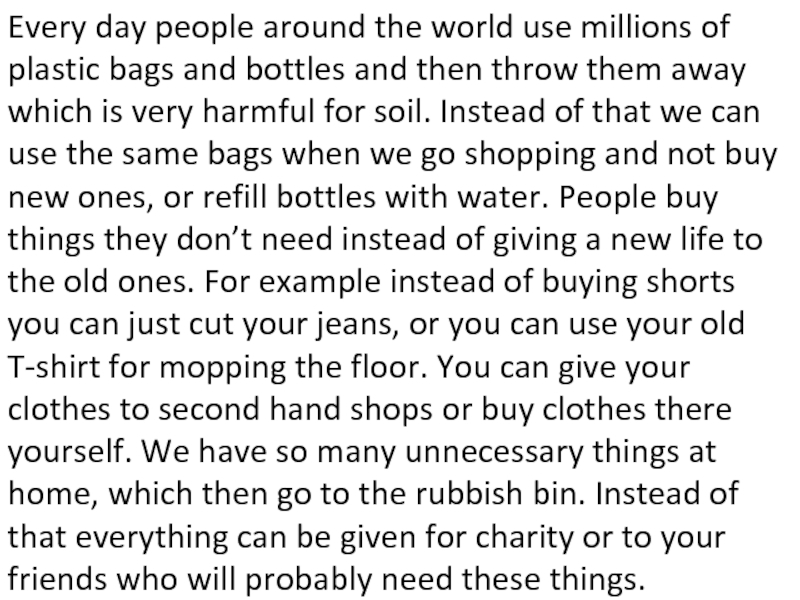 and bottles and then throw them away which is very harmful for soil. Instead of that we can use the same bags when we go shopping and not buy new ones, or refill bottles with water. People buy things they don’t need instead of giving a new life to the old ones. For example instead of buying shorts you can just cut your jeans, or you can use your old T-shirt for mopping the floor. You can give your clothes to second hand shops or buy clothes there yourself. We have so many unnecessary things at home, which then go to the rubbish bin. Instead of that everything can be given for charity or to your friends who will probably need these things.