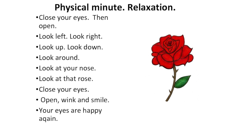 Physical minute. Relaxation. Close your eyes. Then open. Look left. Look right. Look up. Look down.Look around.Look