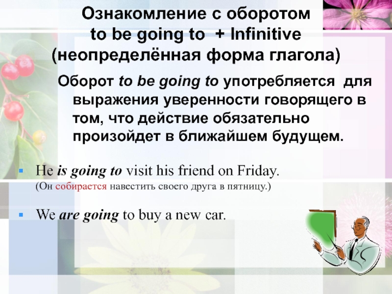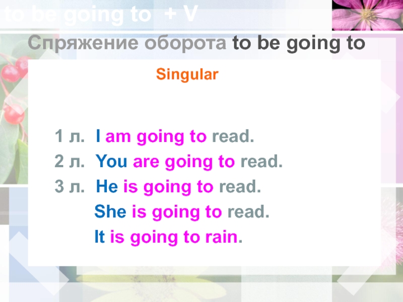 Оборот to be going to употребляется для выражения уверенности говорящего в том, что действие обязательно произойдет в ближайшем будущем.