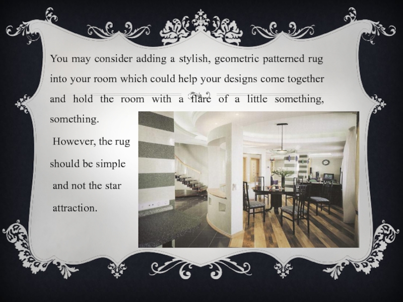 Слайд 13You may consider adding a stylish, geometric patterned rug into your